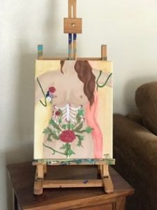 Esta pieza representa cómo siento que la endometriosis va invadiendo mi cuerpo. A través de la rosa se manifiesta la belleza del nido de la vida, lo que es la esencia de ser mujer. En complicidad con ella está la hiedra, que esparce sus redes sobre mi cuerpo buscando una vida más duradera; es una condición que me consume y me seca.